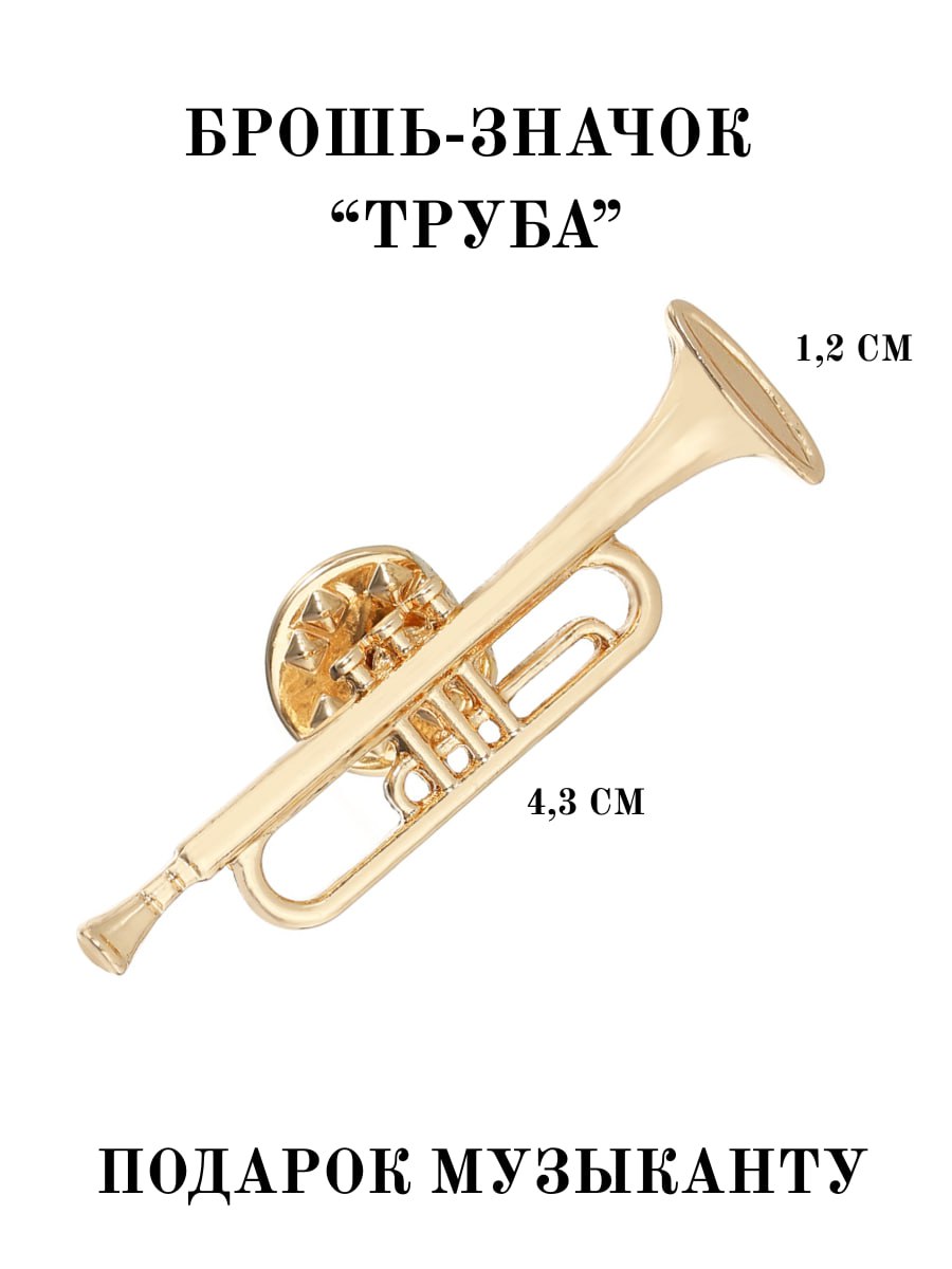 Изящная брошь в виде трубы выполнена из металла с аккуратной детализацией. Идеальный аксессуар для любителей музыки и оригинальных украшений. Подходит для повседневного и праздничного образа.