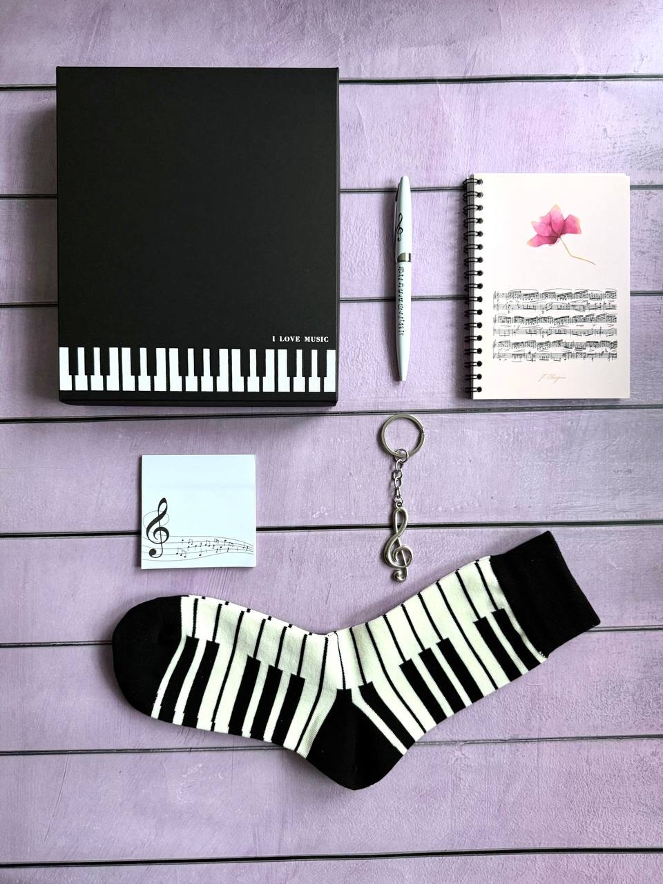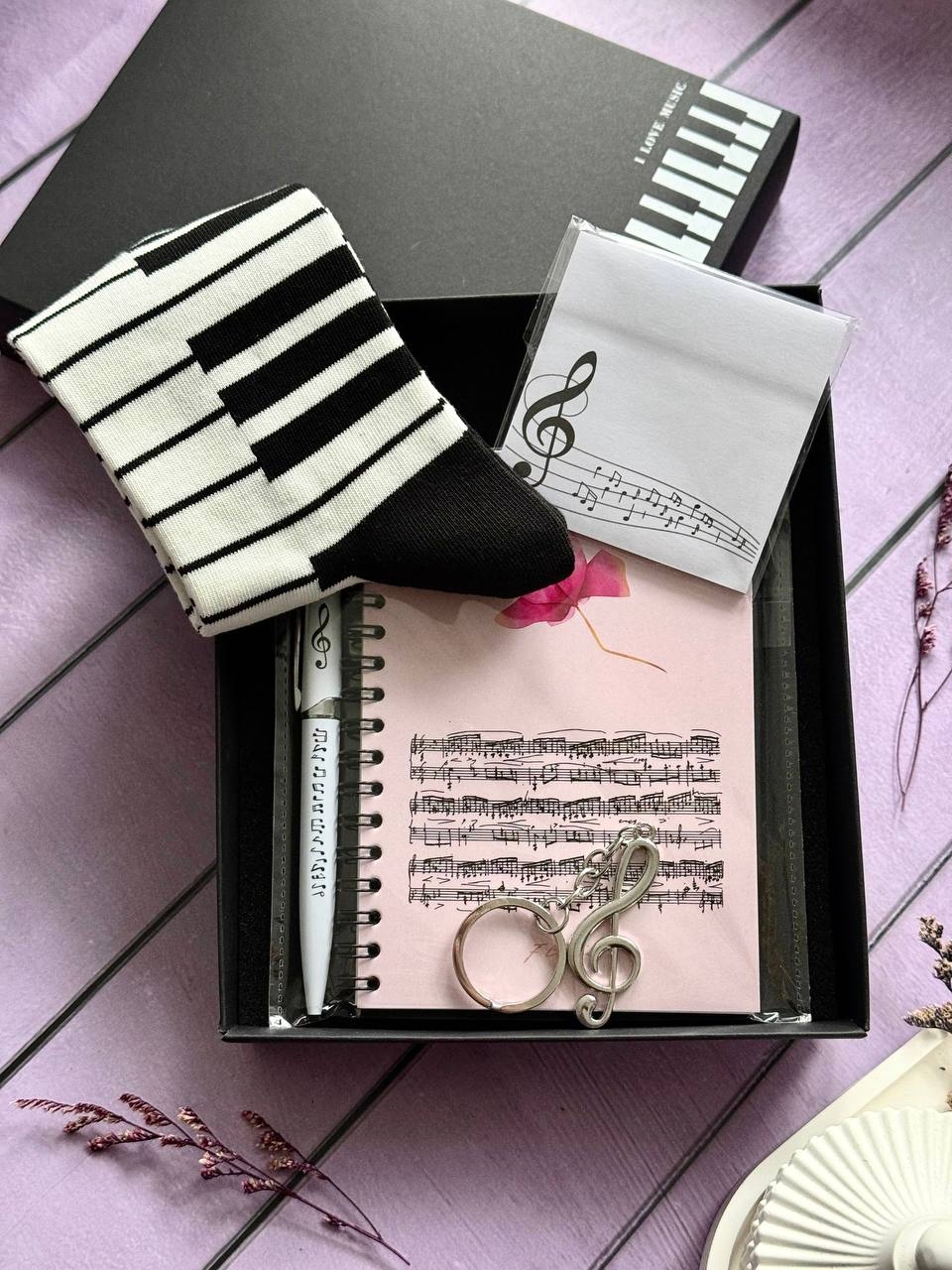 В наборе: подарочная коробка, блокнот формата А6, ручка, носки, брелок, стикеры для заметок.